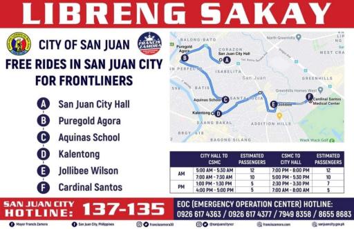 The San Juan City government is offering free ride for all city medical frontliners as the city’s way of thanking them in the fight against the coronavirus disease (COVID-19). Mayor Francis Zamora said the city hall bus will be used to ferry and fetch the medical front liners in going to work and back due to the suspension of public transport under the modified enhanced community quarantine (MECQ) in Metro Manila. ...