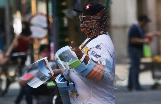 The government is planning to promote the local production of face shields that will provide people with an extra layer of protection from the coronavirus infection. A vendor holds his DIY face shield sold for 70 pesos as a precautionary measure against COVID 19 at Paco, Manila. ...
