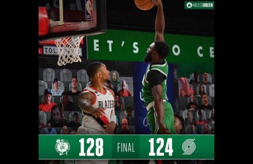 Boston saw Jayson Tatum and Jaylen Brown combine for 64 points in a 128-124 win over Portland in the NBA restart on Sunday (US time).