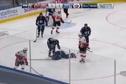 Игрок «Виннипег Джетс» Такер Пулман получил травму головы в матче плей-офф Национальной хоккейной лиги (НХЛ) против «Калгари Флэймс». На ролике видно, что Пулман лег под бросок Микаэля Баклунда, и летящая шайба нанесла ему удар по лицу. В результате хоккеист был вынужден покинуть площадку, но успел залить лед кровью.